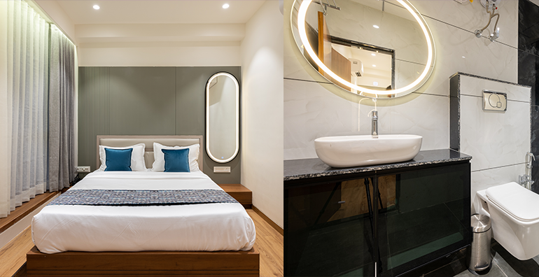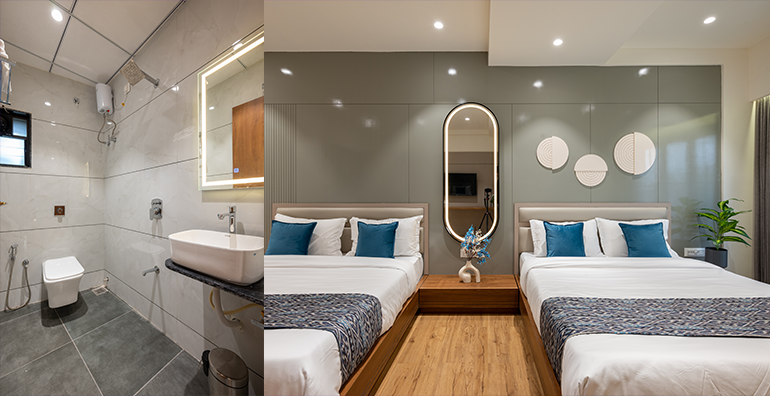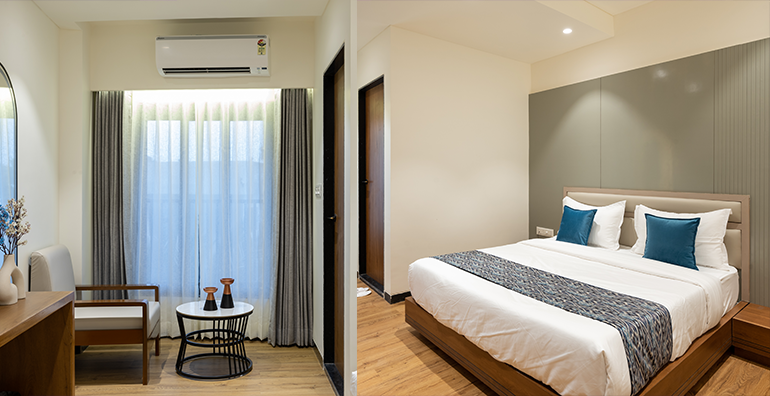 • Deluxe AC Rooms with City View (4): Relax with a beautiful view of the city skyline in our Deluxe AC Rooms, offering a comfortable, air-conditioned retreat with modern comforts.